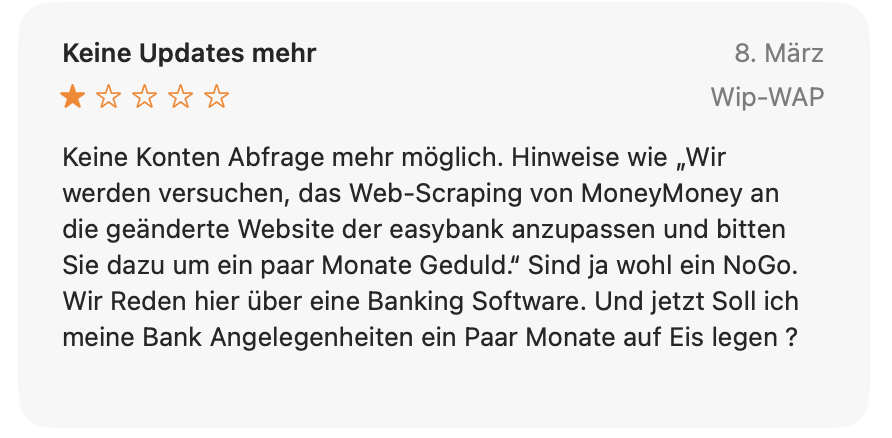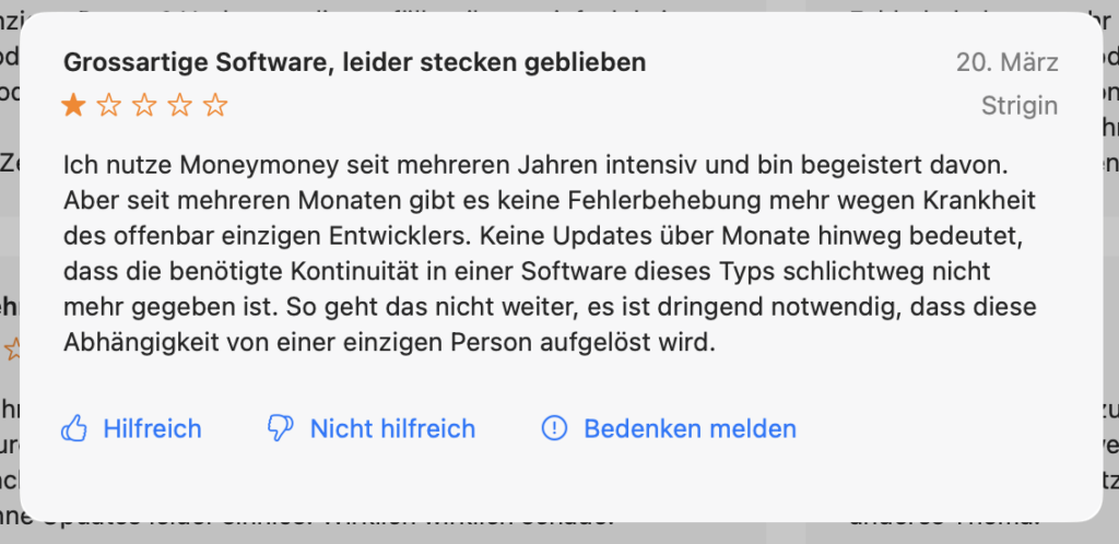 Der Entwickler verlangt dafür einen Einmalpreis von 39,99 €. In den letzten 10 Jahren gab es nie ein Upgrade, für das man das Programm neu kaufen musste. Alle Bestandsnutzer werden also kostenlos mitversorgt. Aktuell hängt die Entwicklung ein bisschen. In den letzten Monaten gab es aber wenigstens ein Update. Wenn man eine normale Bank mit einer soliden HBCI-Schnittstelle hat, gibt es auch gar keine Probleme. Wenn die eigene Bank nur durch Webscraping unterstützt wird – was meiner Meinung nach ein Grund ist, die Bank zu wechseln –, bewirkt eine Änderung bei der Bank natürlich funktionale Einschränkungen.